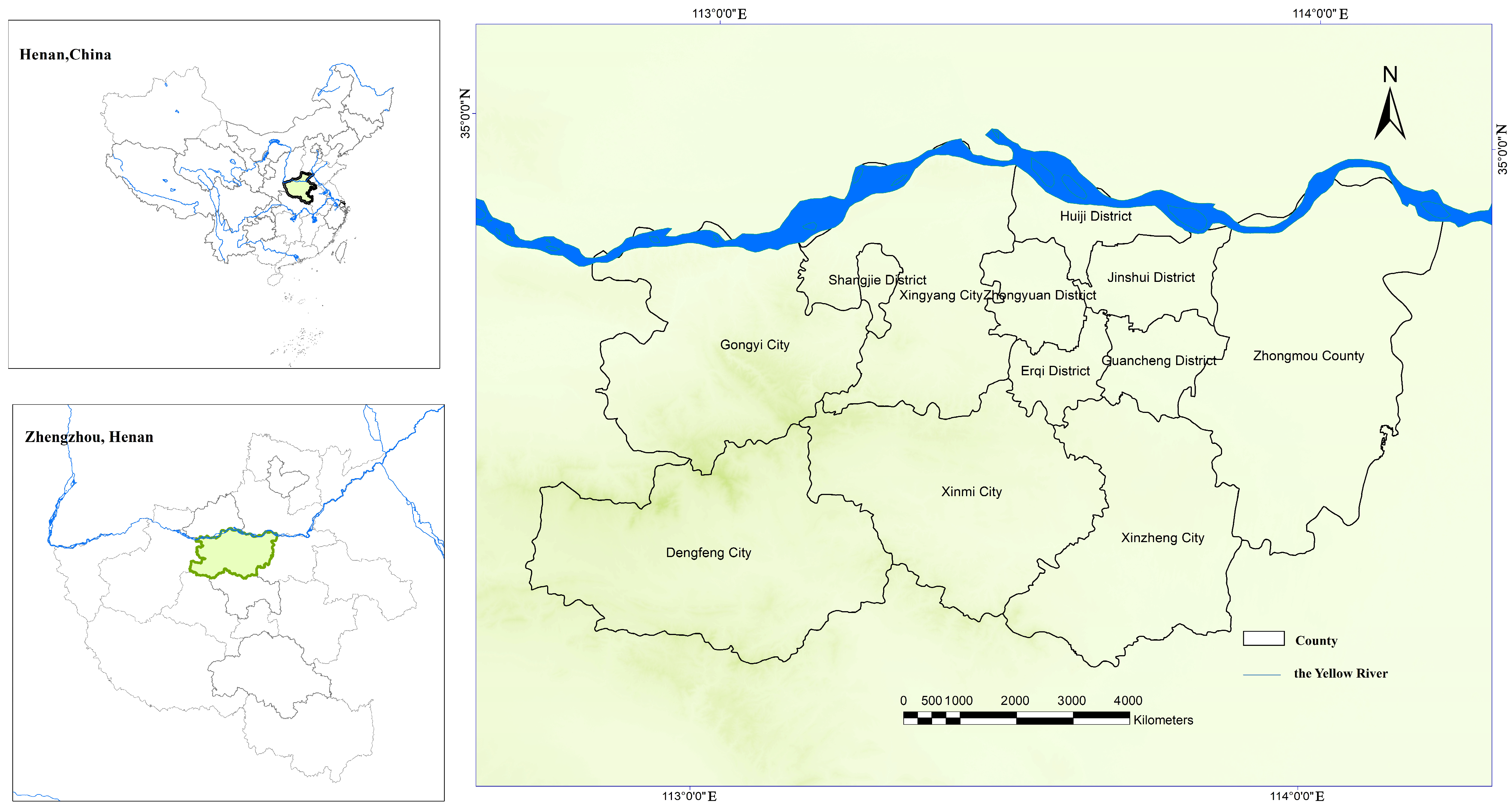 - Zhengzhou Bureau of Natural Resources and Planning. Overall Land and Space Plan of Zhengzhou City (2021–2035); Zhengzhou Bureau of Natural Resources and Planning: Zhengzhou, China, 2025. [Google Scholar]