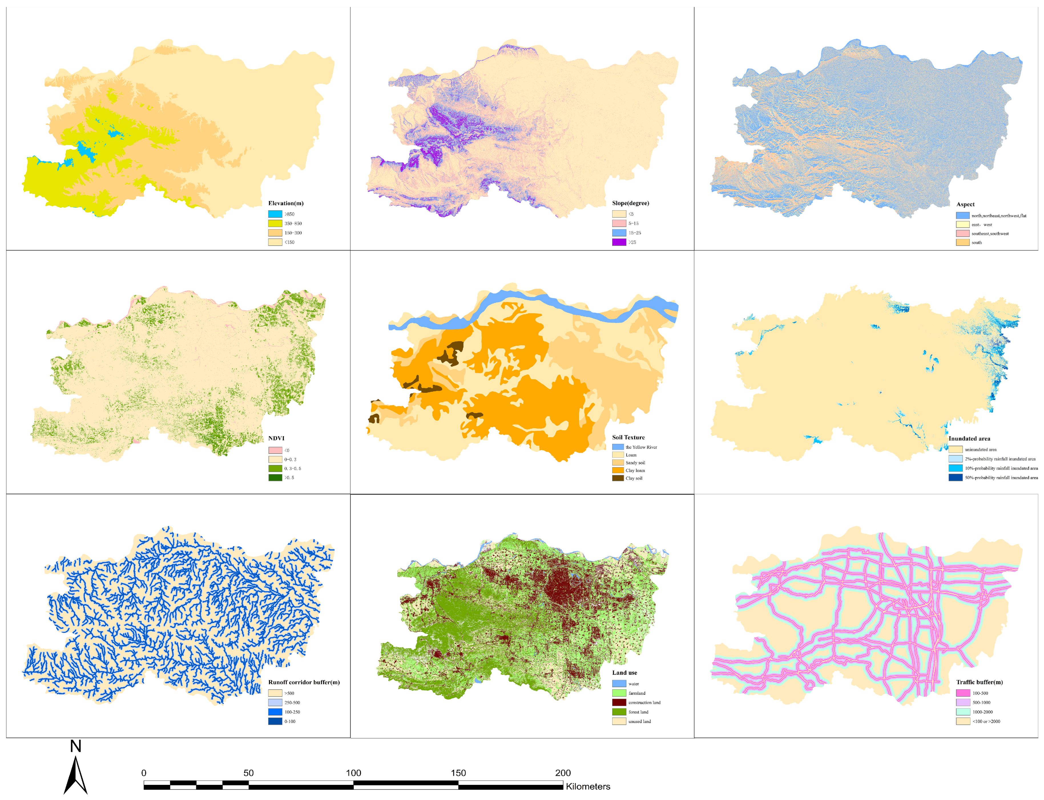 | Elevation | Slope | Aspect | NDVI | Soil Texture | Inundated Area | Runoff Corridor | Land Use | Traffic Buffer | |