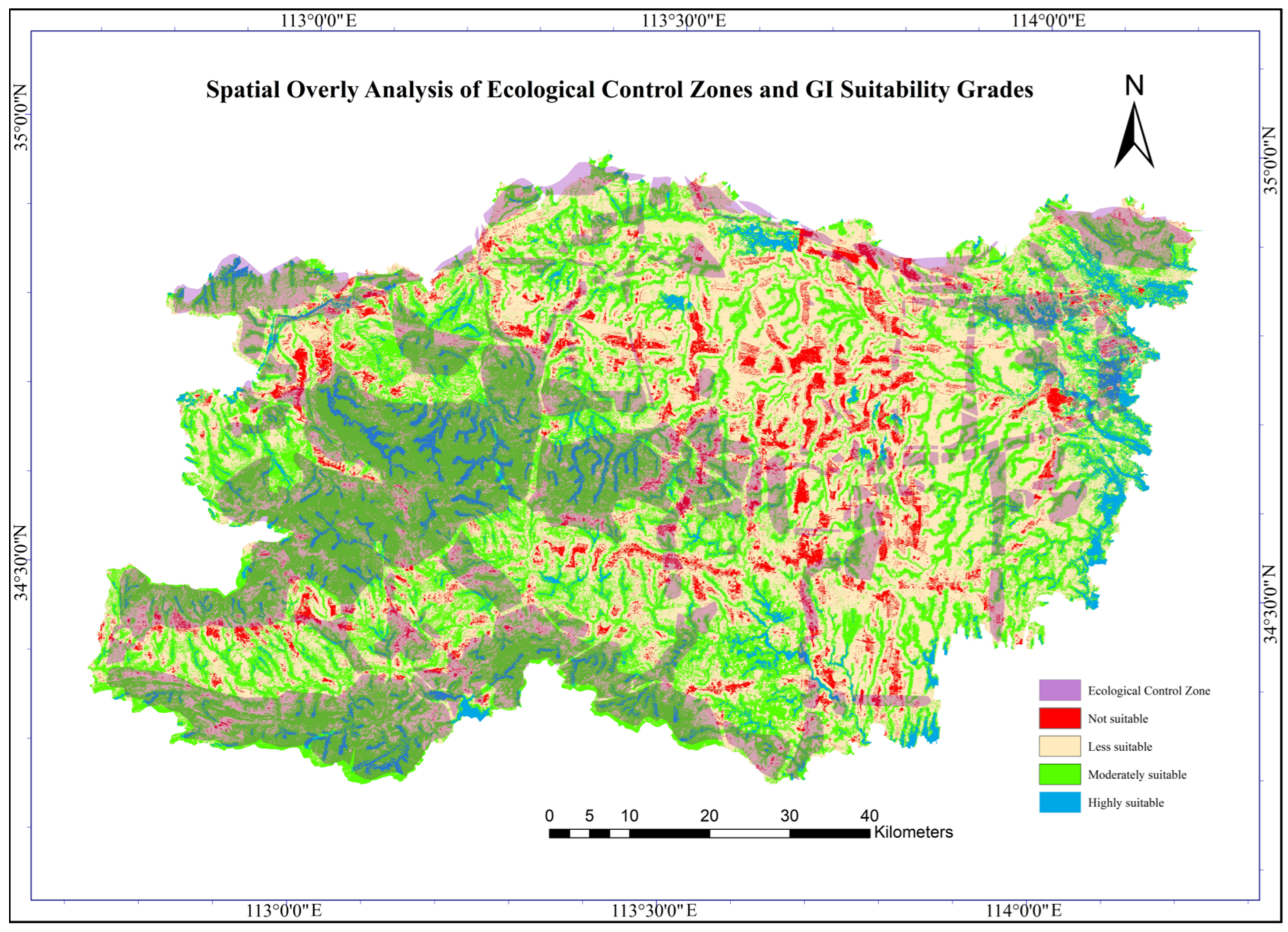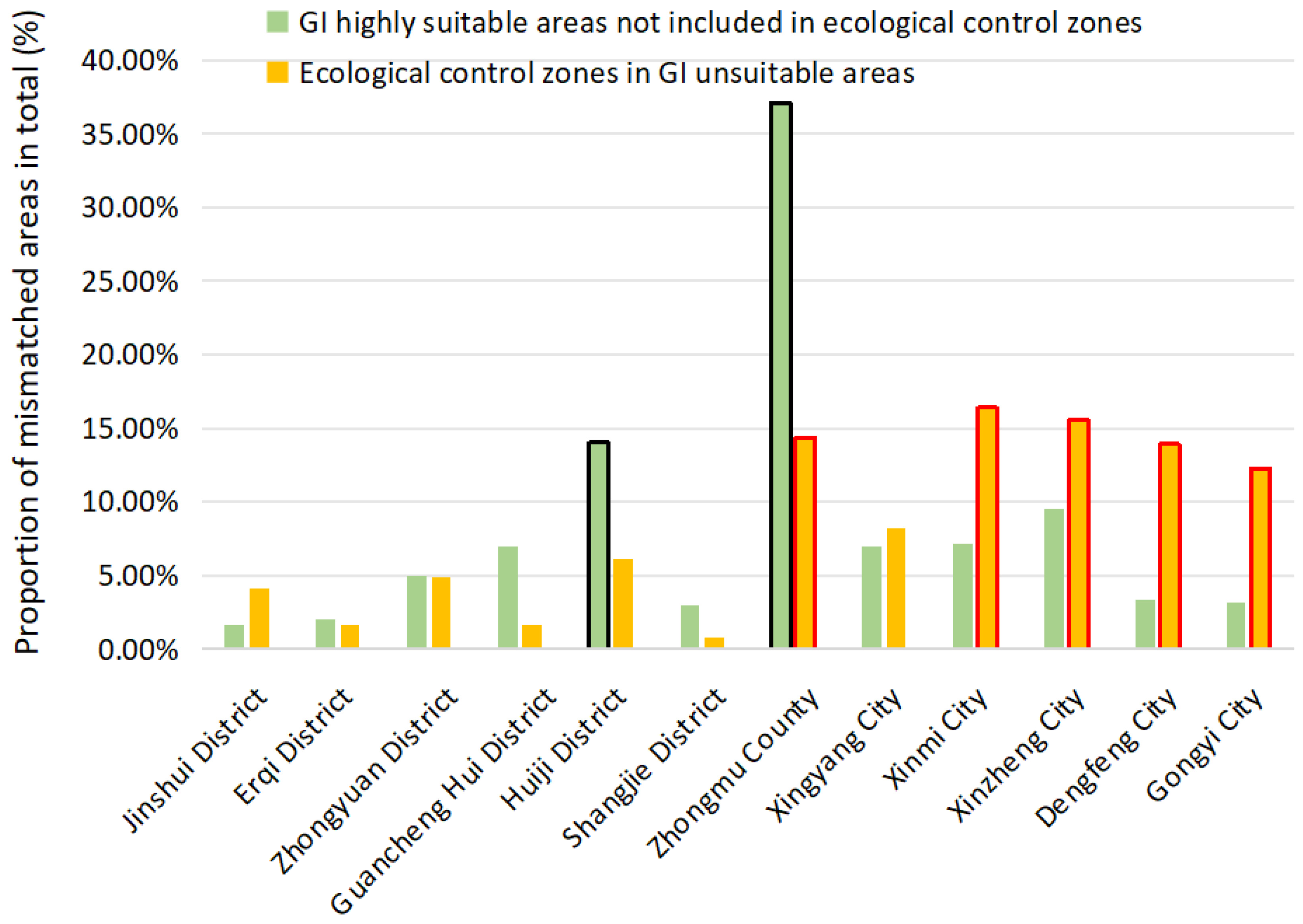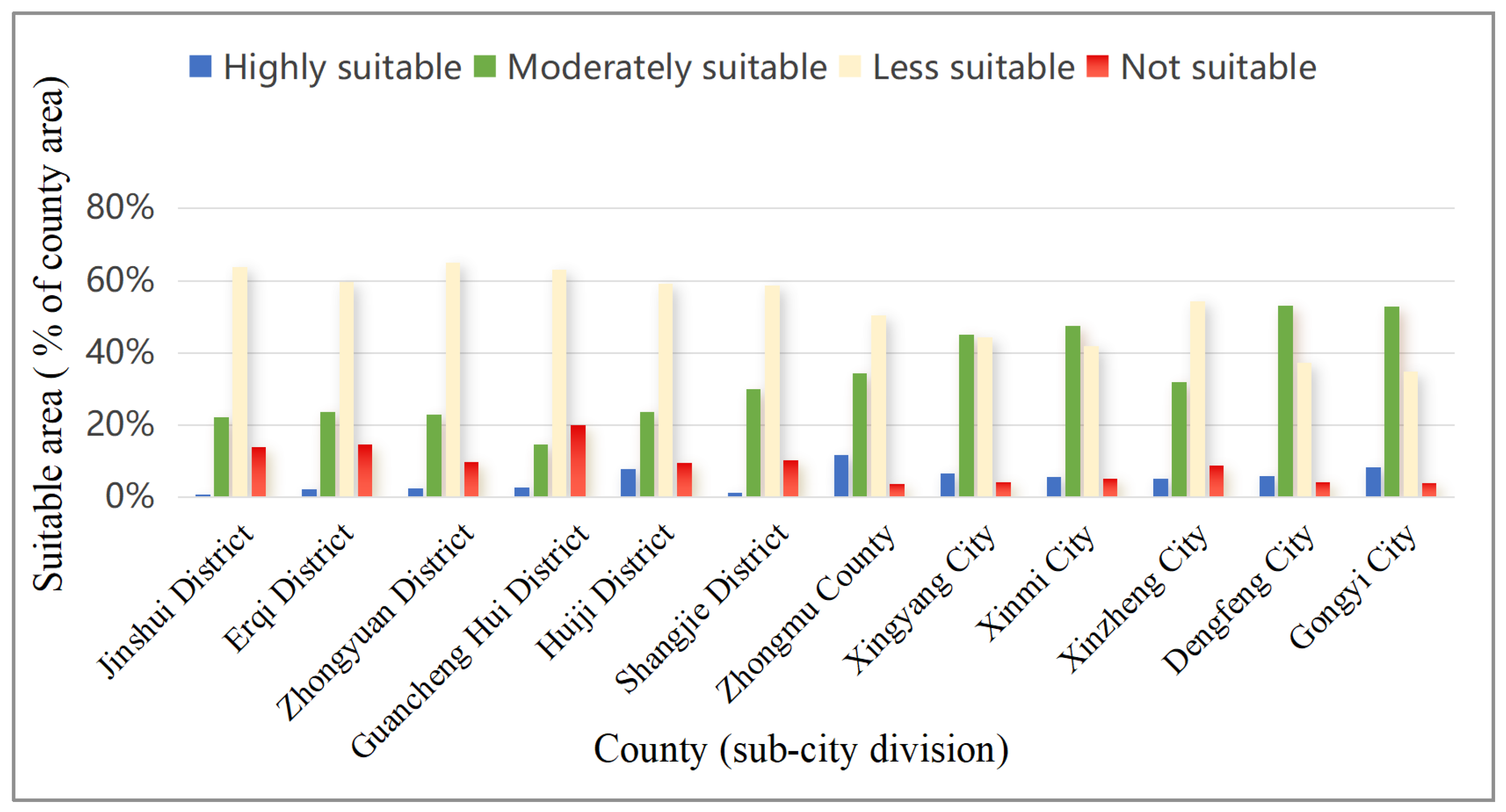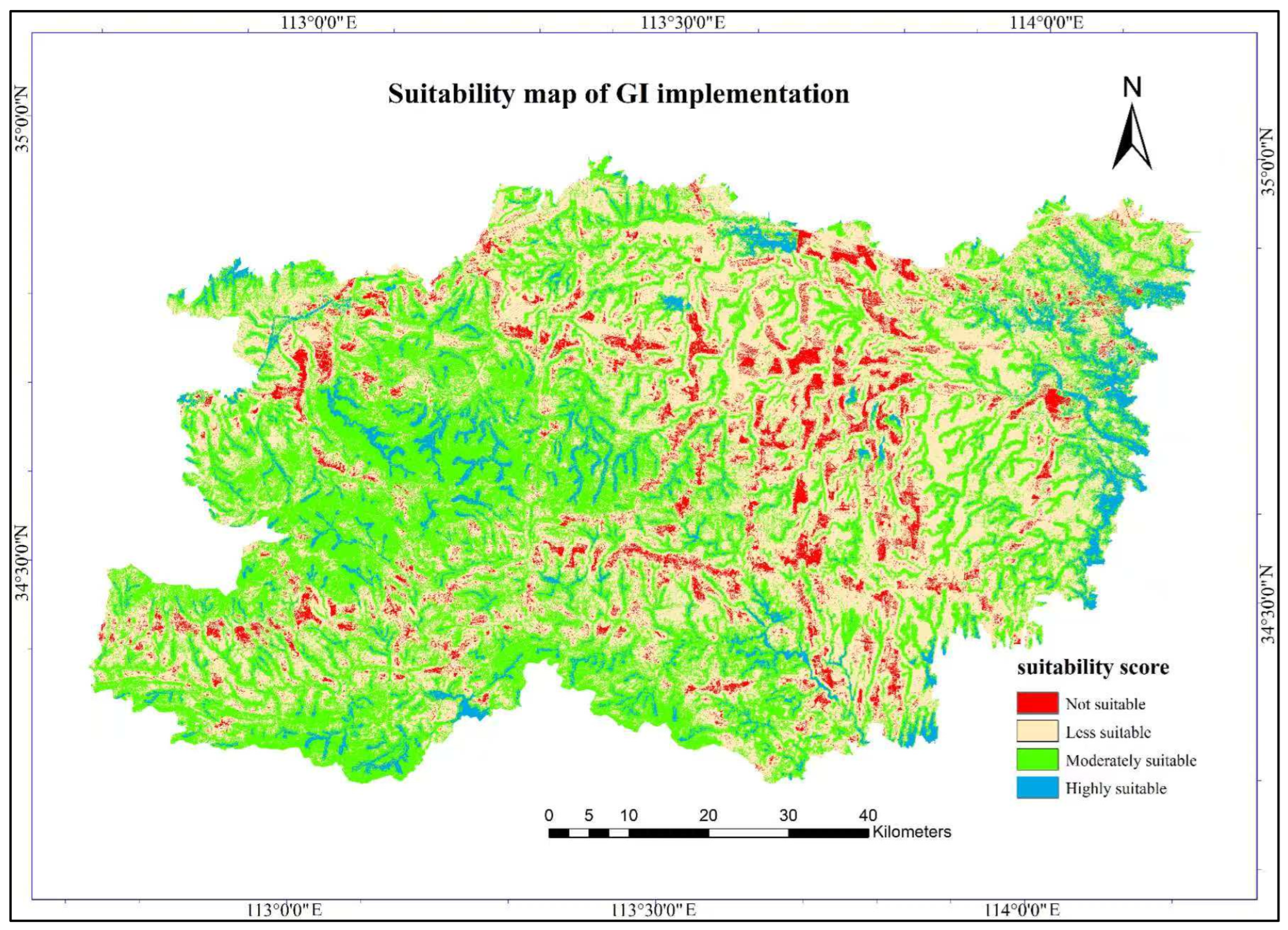 - 6.8% of the land in Zhengzhou is highly suitable for developing GI, while 6% of the land is not suitable. These proportions are not fully comparable to existing studies, mainly due to differing scales and indicator frameworks.