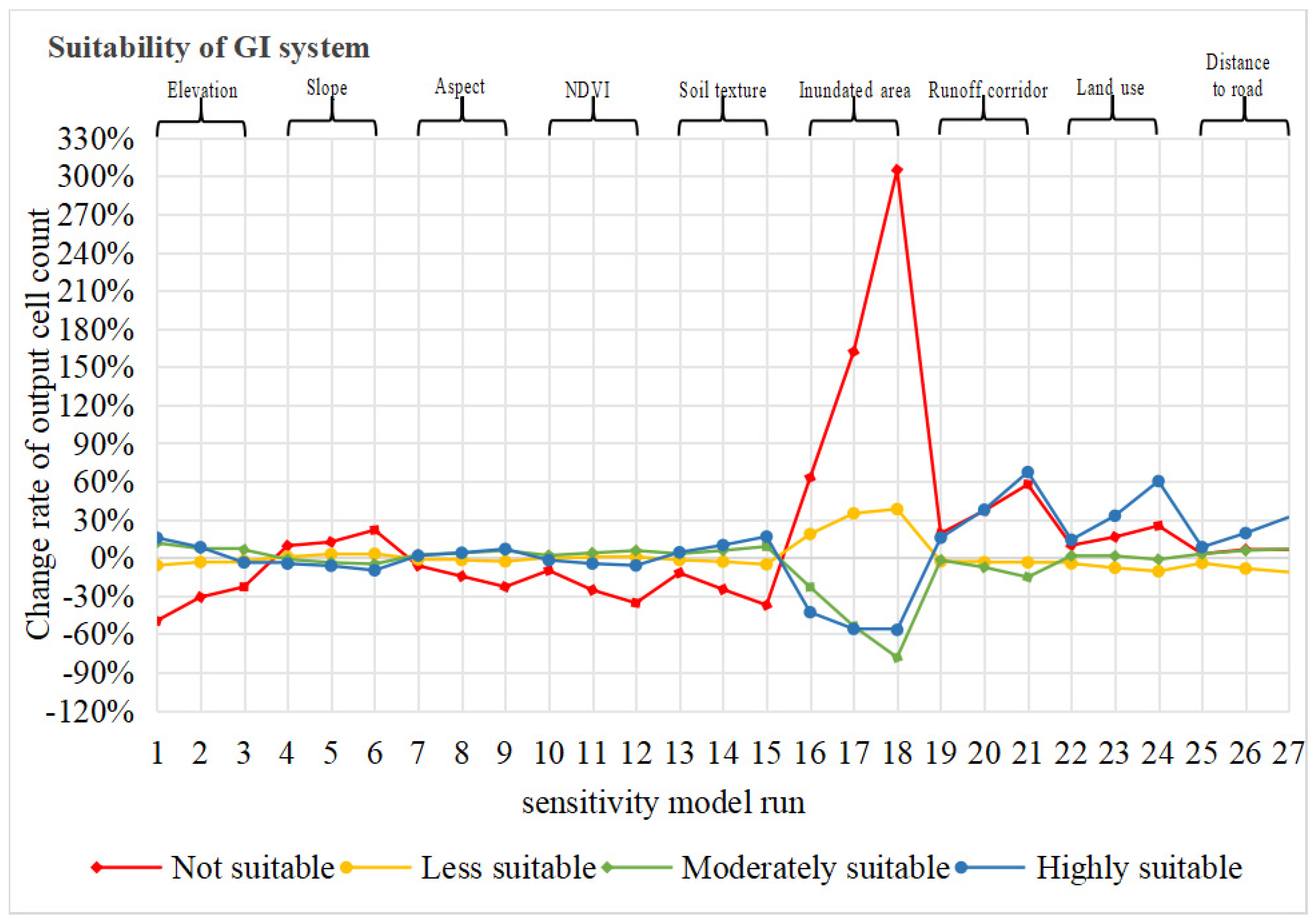 | Highly suitable | 0.165 | 0.0102 | Runoff corridor (38%); Land use (32%) | Runoff corridor × Land use (28%) |