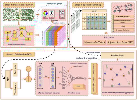 Pipeline of the proposed LA-GATs for building clustering.