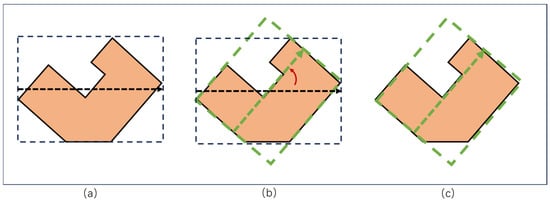 The Minimum Bounding Rectangle (MBR) method refers to the smallest-area (or smallest-volume) rectangle that completely contains a given two-dimensional or three-dimensional geometric object, such as a set of points, polygons, or line segments. Among all possible bounding rectangles, the MBR is the one with the minimal area. In this study, the MBR is employed as the orientation feature of buildings [40]. By rotating the building geometry and computing the rotation angle corresponding to its MBR, we can effectively capture the true directional orientation of the building. The calculation method for the MBR direction is shown in Figure 2.