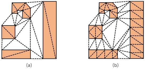 Comparison of constrained Delaunay triangulation before and after refinement. (a) is the Delaunay triangulation directly constructed based on the building vertices; (b) is the triangulation constructed after refinement using interpolation encryption.