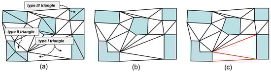 Triangle classification and adjacency distance computation: (a) examples of the three classified triangle types; (b) result after removing Type 3 triangles; (c) Red lines indicate the Delaunay triangulation edges incident to the lower-left and lower-right buildings; these edges are used to compute the adjacency distance between the two buildings.
