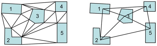 The nearest neighbor graph serves as the basis for constructing the building feature matrix. It is constructed using the Constrained Delaunay Triangulation (CDT). In the triangulation generated from the CDT, if there exists at least one Type 1 connection triangle between two building polygons, the two buildings are considered to have spatial adjacency [49].