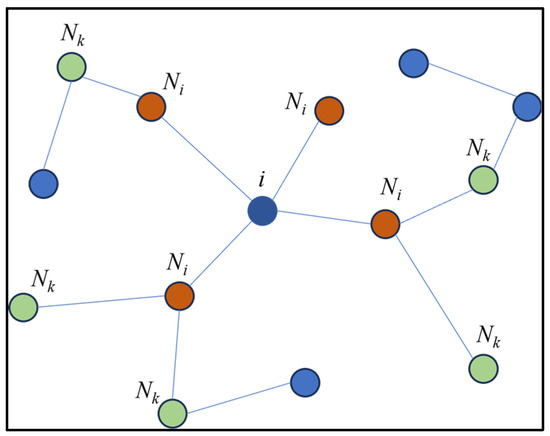 Schematic diagram of the building proximity graph. i represents a building node in the GATs training; Ni represents the first-order neighboring nodes of node i; Nk represents the second-order neighboring nodes of node i.