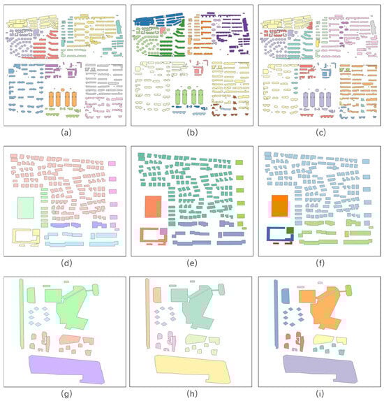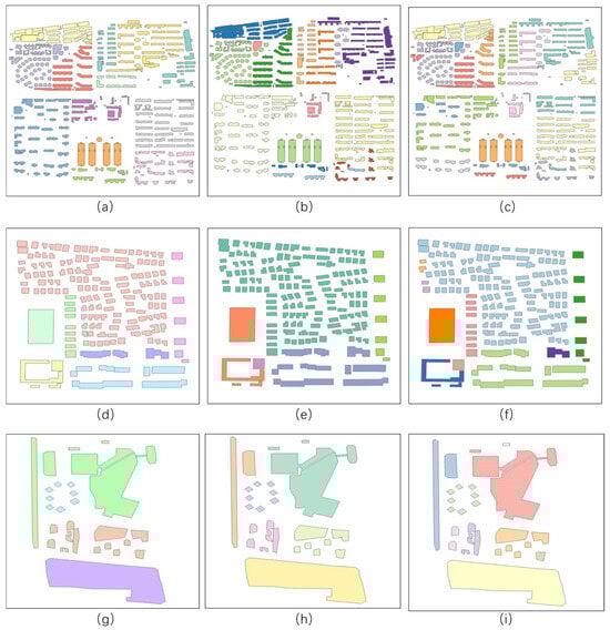 Clustering results of the comparative experiment; (a,d,g) are the artificial clustering results of Test1, Test2, and Test3, respectively; (b,e,h) are the clustering results of Test1, Test2, and Test3 after second-order neighborhood aggregation; (c,f,i) are the clustering results of Test1, Test2, and Test3 after first-order neighborhood aggregation.