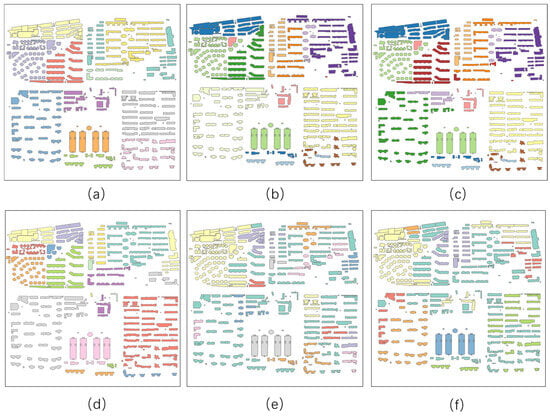 Clustering results of the comparative experiment; (a) is the artificial clustering result/ground truth label for Test 1; (b) is the clustering result of the proposed method for Test 1; (c) is the GATs clustering result for Test 1; (d) is the MST clustering result for Test 1; (e) is the DBSCAN clustering result for Test 1; (f) is the K-means clustering result for Test 1.