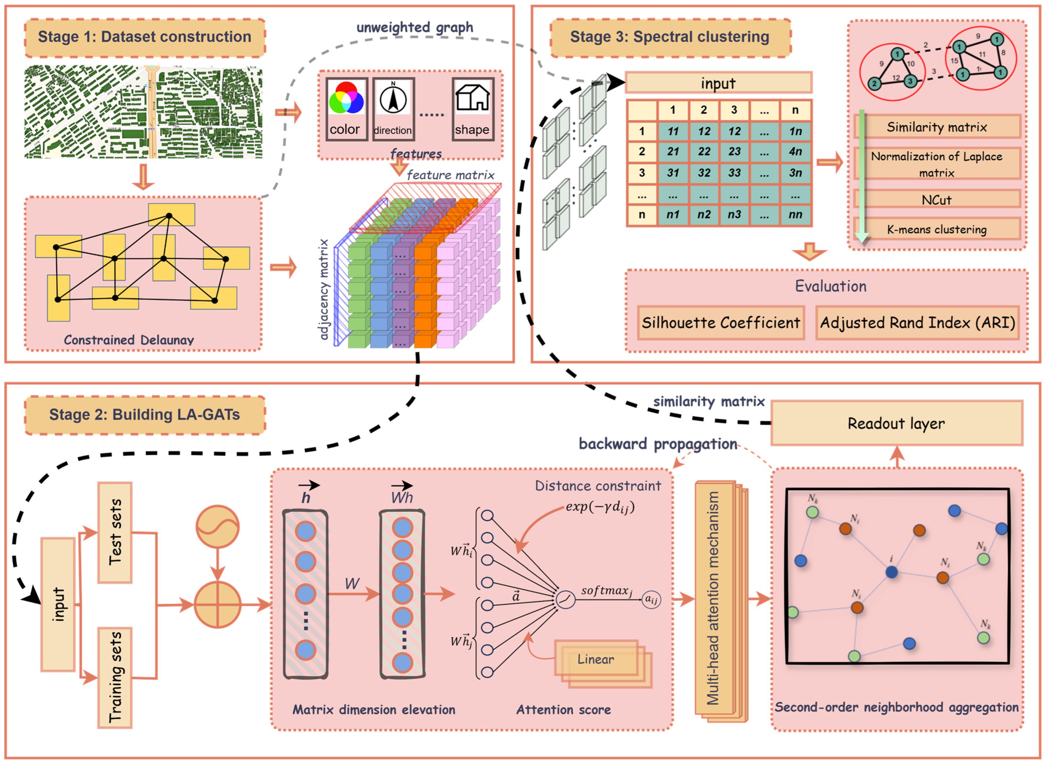 - Step 2: Building the feature similarity matrix. Pass the feature matrix as input to the Graph Attention Network (GAT). During the learning of attention coefficients, a distance bias term (distance decay factor) is incorporated to ensure continuity in the spatial distribution of buildings. A multi-head attention mechanism is adopted to improve model accuracy and enhance the stability of feature representation, while a second-order neighborhood aggregation strategy is employed to mitigate the propagation of errors caused by imperfections in Delaunay triangulation construction.