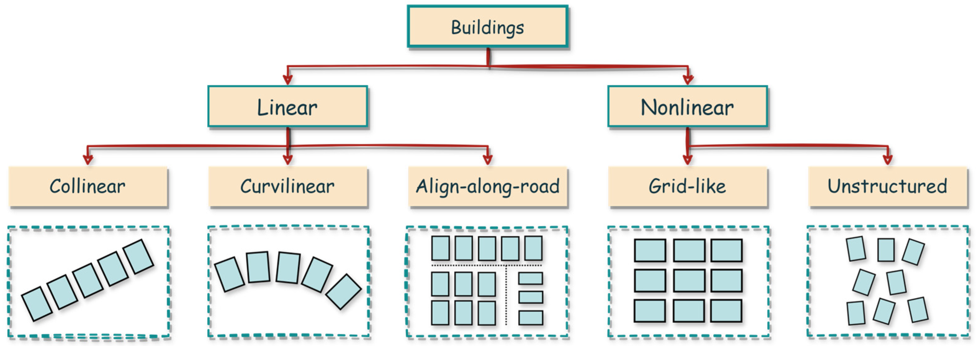 - He, X.; Deng, M.; Luo, G. Recognizing Building Group Patterns in Topographic Maps by Integrating Building Functional and Geometric Information. ISPRS Int. J. Geo-Inf. 2022, 11, 332. [Google Scholar] [CrossRef]