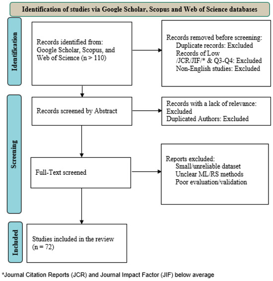 Consequently, more than 110 articles were reviewed. Then, some articles that were less relevant or had similar content, authors, or were published in a non-English language or low-impact journals were excluded for further analysis. Low relevance was defined as studies in which GEE was only mentioned peripherally (e.g., used solely for visualization without substantive analysis), duplicate or overlapping case studies from the same research groups, or works outside the scope of LULC change (e.g., studies focused exclusively on climate modeling or atmospheric monitoring). For cases where multiple studies by the same first author were found, the most recent and comprehensive paper was retained as representative. Finally, 72 articles were selected, including 11 review articles on GEE and 61 articles on the use of GEE in LULC-related topics for in-depth analysis. These selected articles represent a comprehensive and significant body of work in the field of GEE-based LULC research.