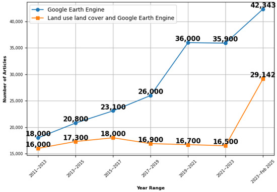 Regarding the number of articles that utilized GEE in LULC-related research, there were fluctuations over the years. Growth was observed in earlier years (2013–2017), which can be attributed to the increasing popularity and accessibility of GEE. This was followed by a slight slowdown in the later years (2017–2023), possibly due to the field’s maturation, the need for more complex and time-consuming research, and the recession that accompanied the global pandemic COVID-19. However, a significant increase in publications integrating GEE and LULC was noted in recent years (2023–2025), marking a notable rise. This surge could be due to recent developments in the GEE, new research applications, an increased focus on urban expansion-related topics, and LULC monitoring using remote sensing data. Figure 2 illustrates the timeline of research trends observed through scientific search databases “Google Scholar, Scopus, Web of Science” that focused on GEE alone compared to studies that combined GEE and LULC-related studies between 2011 and 2025. Two-year intervals were chosen to simplify the visualization and highlight broad temporal patterns in GEE–LULC publications, rather than focusing on short-term year-to-year fluctuations.