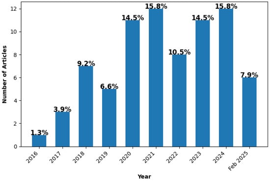 Number of selected studies by year, showing that most of the GEE and LULC-related studies were conducted from 2020 onward. The bar for Feb 2025 represents selected papers that were published in January–February 2025 and are therefore not directly comparable to prior full-year counts.