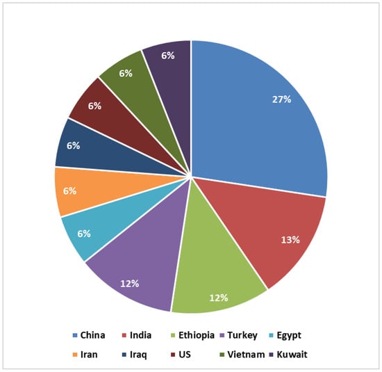 Geographical distribution of case studies by country. Researchers from China contribute the highest percentage of publications, representing 27% of total reviewed articles, followed by India 13%.