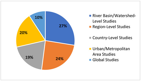 One of the primary outcomes of this study is to highlight the geographical distribution of the reviewed papers. As shown in Figure 4, the studies encompass a diverse range of regions worldwide, including China, India, Ethiopia, Turkey, the US, and Vietnam, among other countries. China appears most frequently in the studies in about 27%, with studies covering various provinces, river basins, urban areas, and more (e.g., “Yangtze River Basin, Yellow River Basin, Shenzhen, Shandong, Hebei, and Liaoning”). after China, India often appears in several studies, accounting for 13%, focusing on districts, sub-basins, and specific regions. (e.g., “Jagatsinghpur district, Kolleru Lake and Munneru Sub-Basin”).