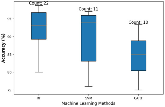 RF, SVM, and CART classifiers’ frequency and accuracy, demonstrating the prevalence of utilizing RF algorithms for data classification tasks over the reviewed studies, as evidenced by providing the highest accuracy range.