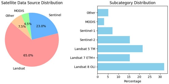 The most common satellite data used in the reviewed articles represent a remarkable prevalence of utilizing Landsat data, followed by Sentinel datasets.