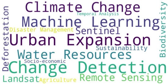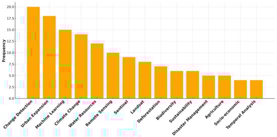 Throughout this study, the replication of common keywords used in the reviewed articles was examined. The analysis of the frequency and percentage distribution of common keywords reveals that “Change Detection” is the most frequently used term, occurring 20 times, which constitutes approximately 28% of the total studies. This indicates a strong focus on the usage of change detection in the context of scientific remote sensing applications and studies. Other key terms include “Urban Expansion” (18 occurrences), “Machine Learning” (15 occurrences), and “Climate Change” (13 occurrences), highlighting the diverse role of remote sensing technologies and GEE platforms in selecting the research’s keywords. The frequent use of these terms suggests a clear trend toward geospatial data-driven approaches and cloud-based processing in recent LULC research. Figure 8 presents the most used keywords, and Figure 9 illustrates a word cloud of the most frequently used keywords in the reviewed studies.