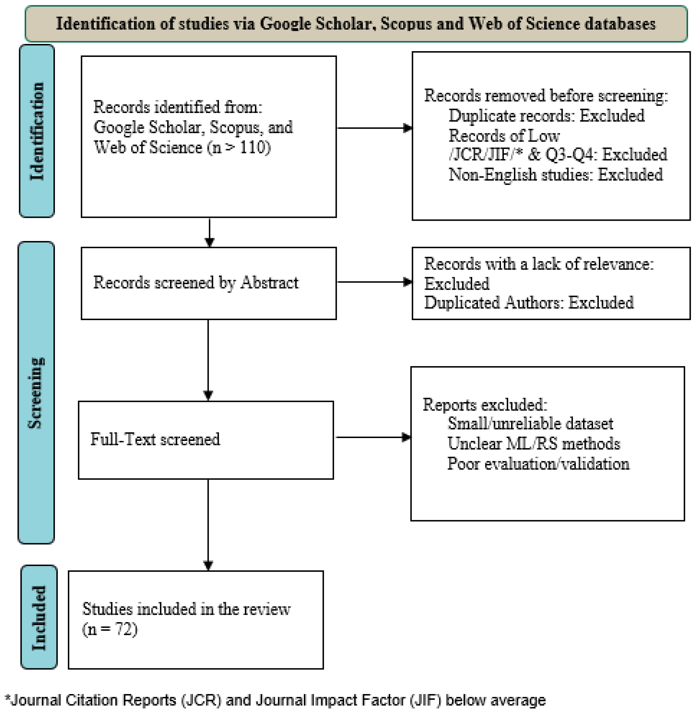 Although this review provides a comprehensive overview of Google Earth Engine (GEE)-based Land Use and Land Cover (LULC) research, it is important to acknowledge several limitations for transparency, clarity, and accuracy. First, the scope of the literature search was intentionally limited to studies that explicitly mentioned “Google Earth Engine” and “Land Use and Land Cover” in their titles, abstracts, or keywords. This careful focus ensured thematic consistency but might have excluded relevant works that used broader or alternative keywords, such as “land use” or “land cover” individually, or those that discussed LULC analysis indirectly. Second, the inclusion criteria were limited to Q1 and Q2 peer-reviewed journals indexed in Google Scholar, Scopus, and the Web of Science databases. This approach emphasized methodological rigor and reproducibility but may have overlooked valuable insights from Q3 and Q4 journals, conference proceedings, and gray literature. Third, although the initial database search yielded over 110 papers, only 72 were retained after applying relevance and quality filters. This sample size constraint reflects a trade-off between analytical depth and comprehensive coverage, which may cause us to overlook region-specific or exploratory studies, as well as valuable research not included in our search criteria. Fourth, bibliometric and reporting inconsistencies among journals, especially differences in author-provided keywords, metadata accuracy, and citation indexing, may have affected the accuracy of the trend analysis and keyword mapping. Finally, the review reflects the state of research up to February 2025, meaning that subsequent publications and evolving analytical frameworks are not captured. Future meta-analyses should therefore consider expanding the search window and keyword set to include newly emerging GEE-LULC applications and methodological innovations.