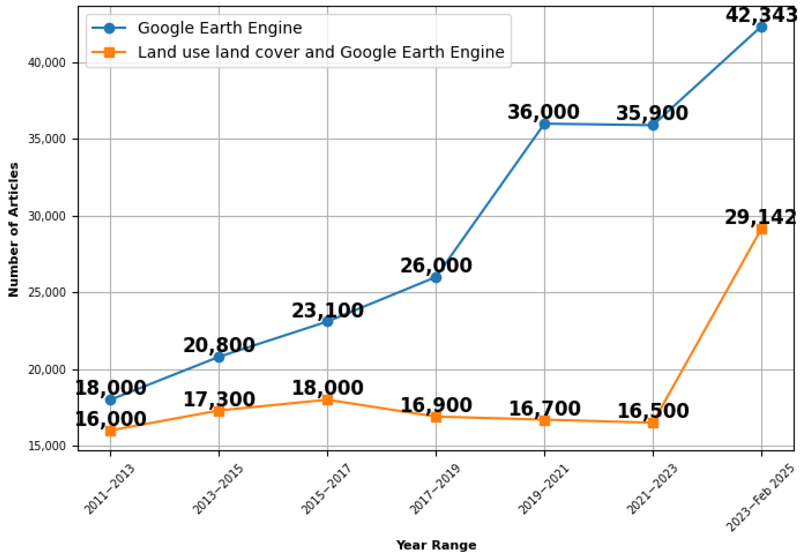 Figure 2. Number of GEE–LULC publications across two-year intervals from 2011 to 2025. The values for 2023–Feb 2025 are based on publications available up to February 2025 and should therefore be considered an estimate. Two-year intervals are used to provide a simplified overview of long-term publication trends, enabling the tracking of changes over time. The timeline shows an overall growth of GEE and LULC-related studies over the years.