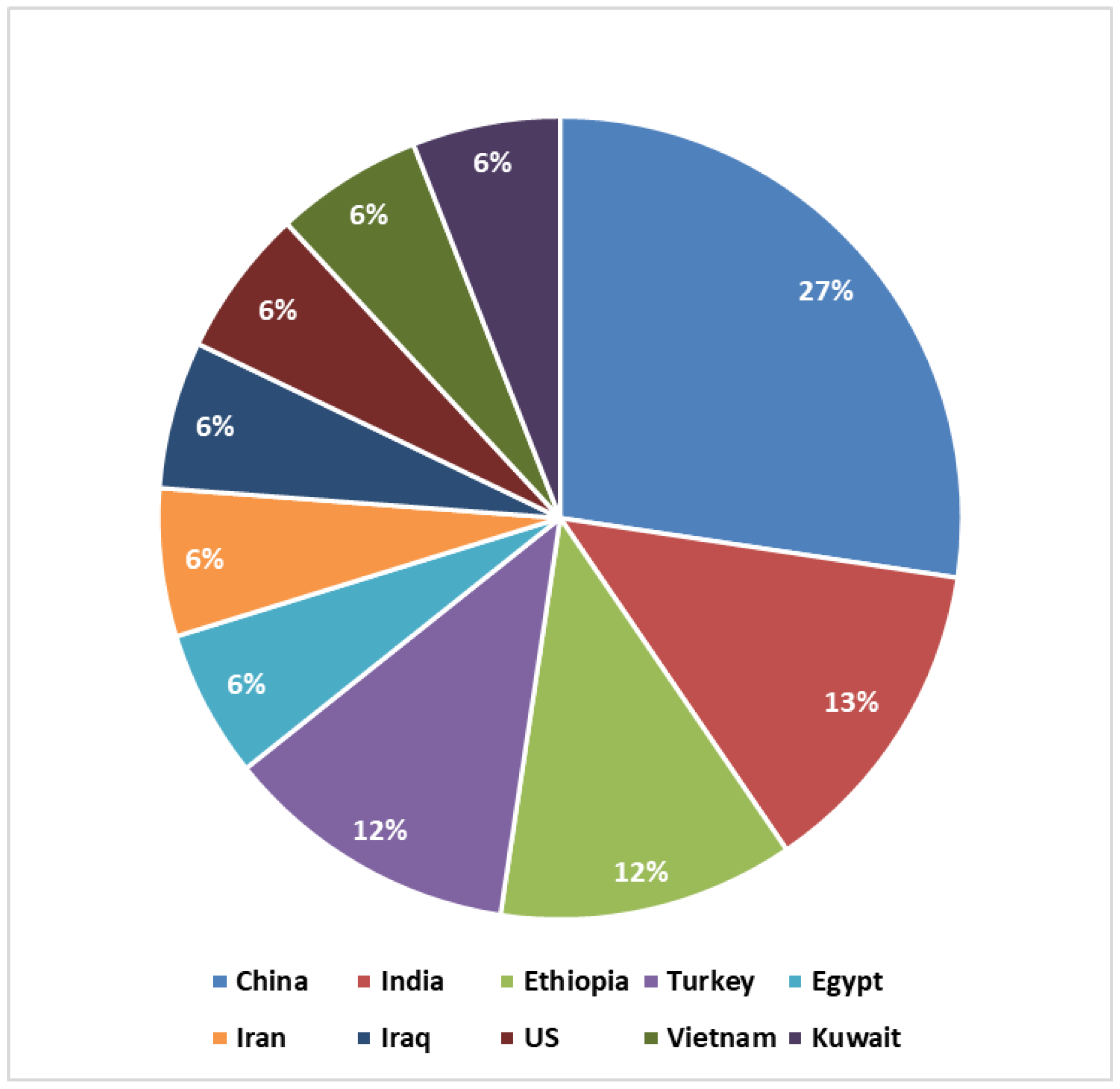 Figure 4. Geographical distribution of case studies by country. Researchers from China contribute the highest percentage of publications, representing 27% of total reviewed articles, followed by India 13%.