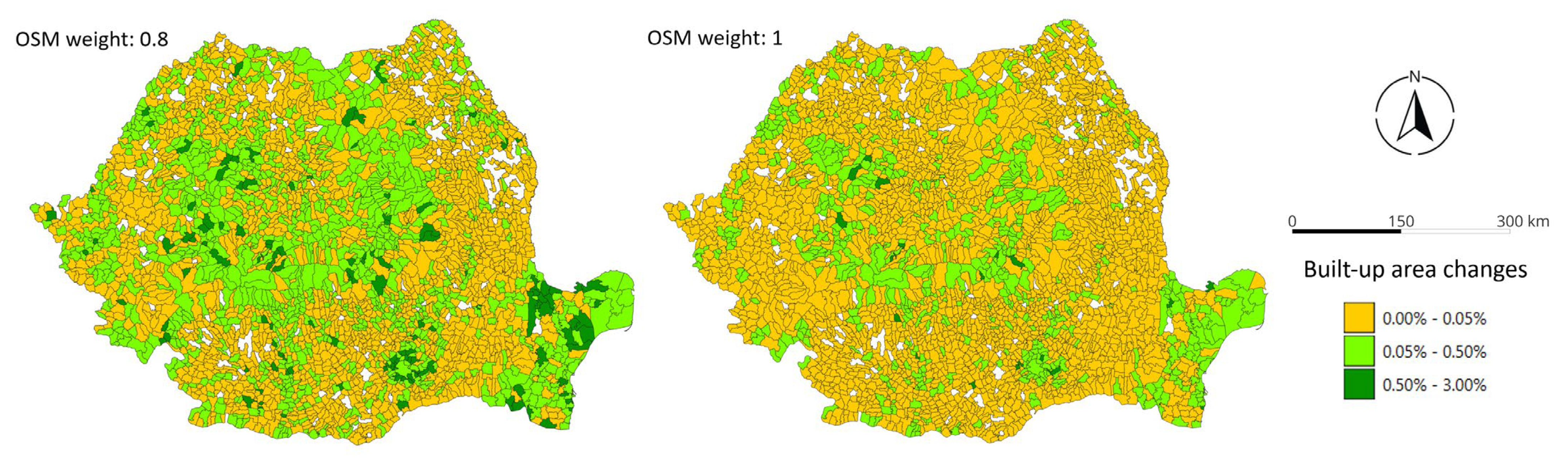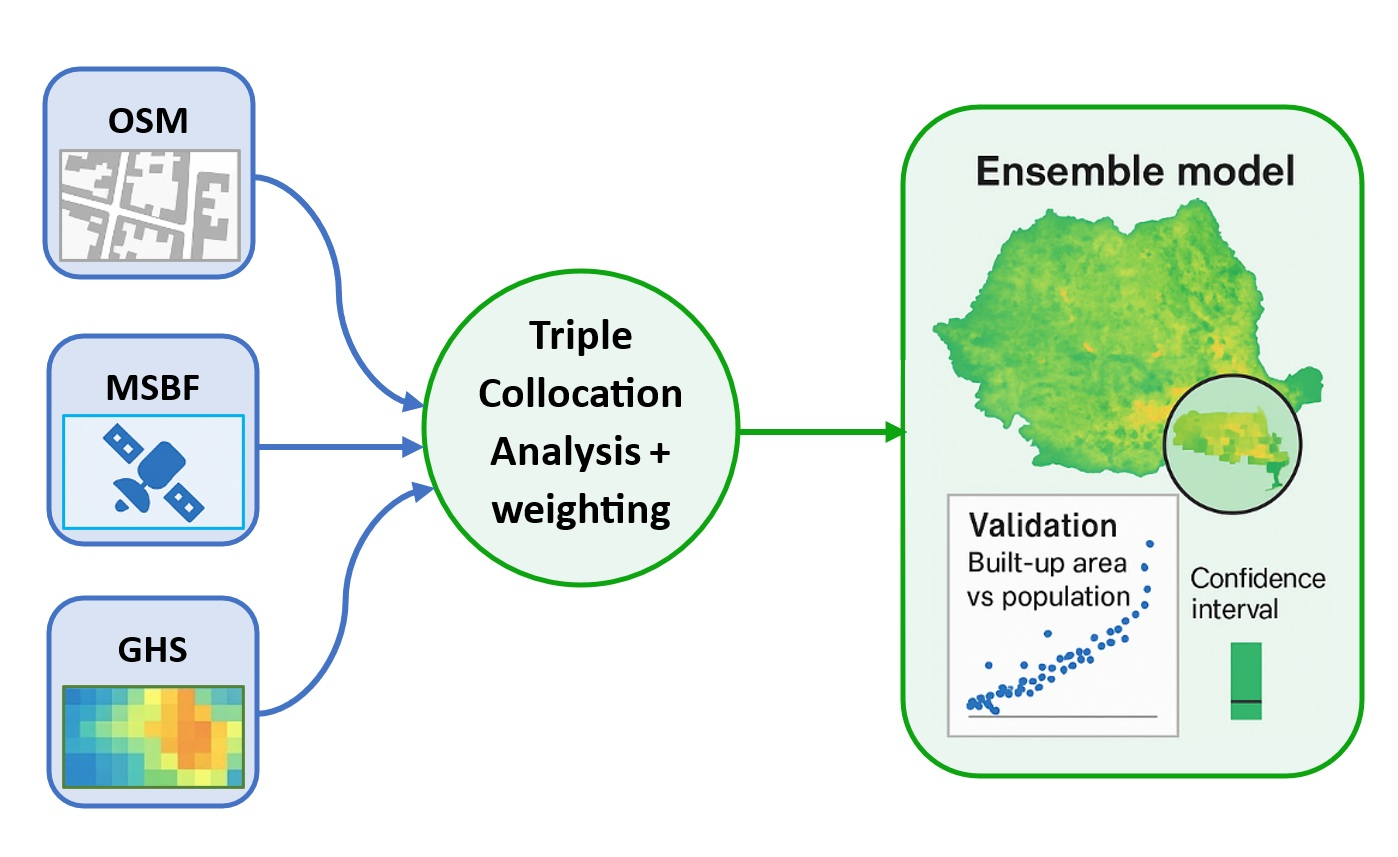 Magyari-Sáska, Z.; Haidu, I. Built-Up Surface Ensemble Model for Romania Based on OpenStreetMap, Microsoft Building Footprints, and Global Human Settlement Layer Data Sources Using Triple Collocation Analysis. ISPRS Int. J. Geo-Inf. 2025, 14, 420. https://doi.org/10.3390/ijgi14110420