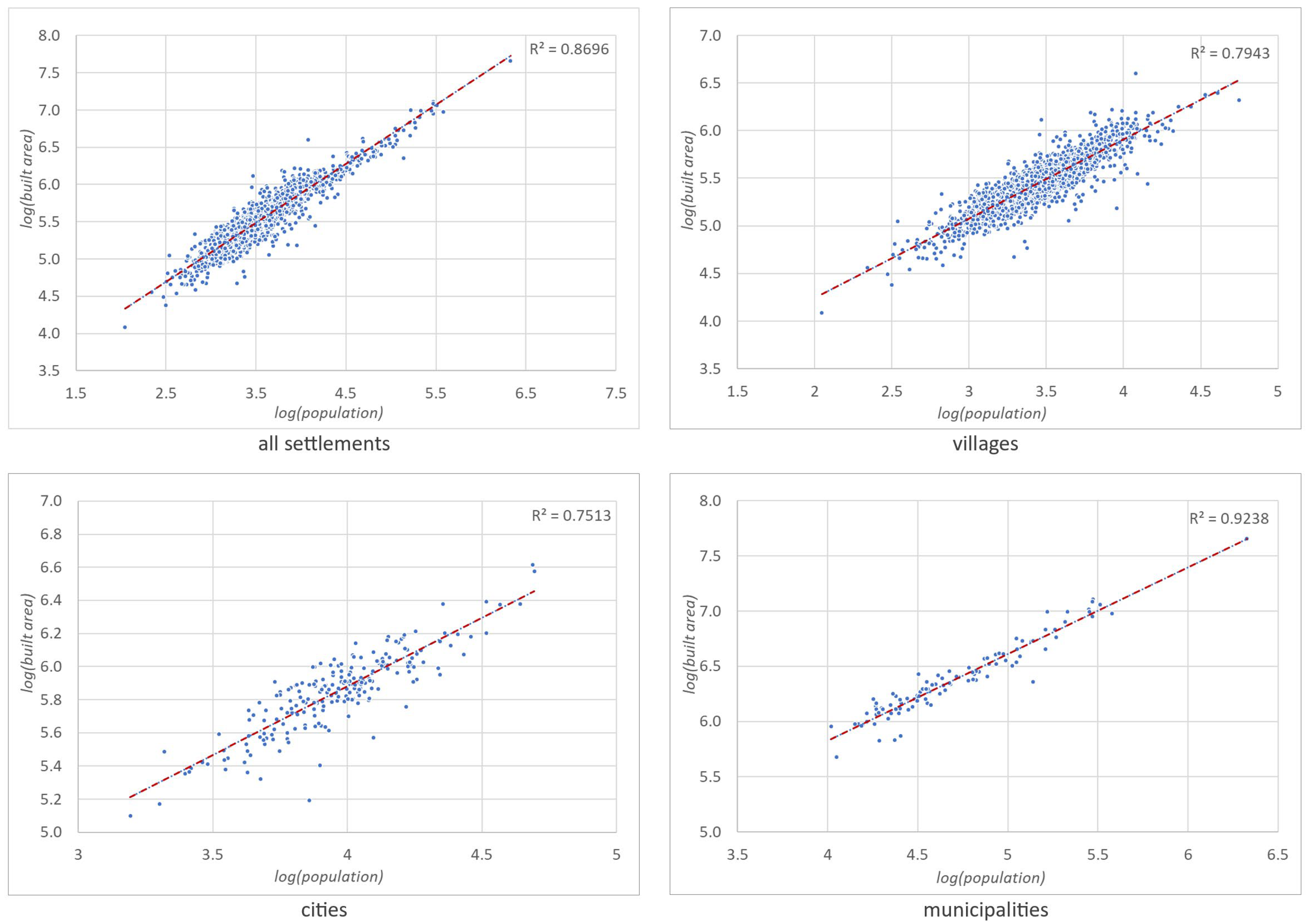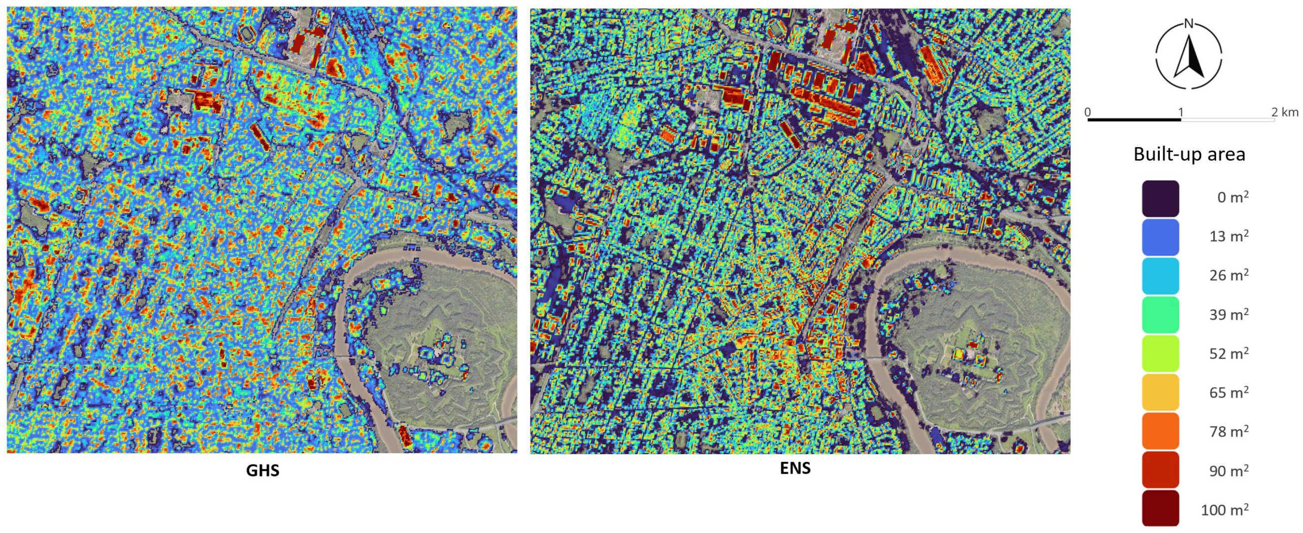 - Pesaresi, M.; Schiavina, M.; Politis, P.; Freire, S.; Krasnodębska, K.; Uhl, J.H.; Carioli, A.; Corbane, C.; Dijkstra, L.; Florio, P.; et al. Advances on the Global Human Settlement Layer by Joint Assessment of Earth Observation and Population Survey Data. Int. J. Digit. Earth 2024, 17, 2390454. [Google Scholar] [CrossRef]