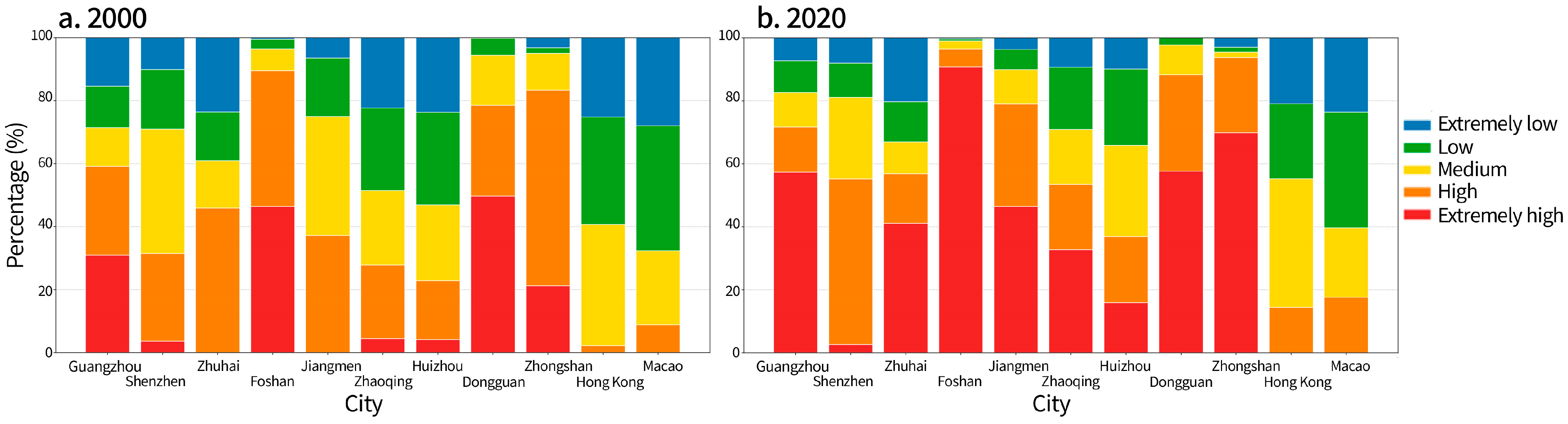 - Deng, X.; Gao, F.; Liao, S.; Liu, Y.; Chen, W. Spatiotemporal Evolution Patterns of Urban Heat Island and Its Relationship with Urbanization in Guangdong-Hong Kong-Macao Greater Bay Area of China from 2000 to 2020. Ecol. Indic. 2023, 146, 109817. [Google Scholar] [CrossRef]