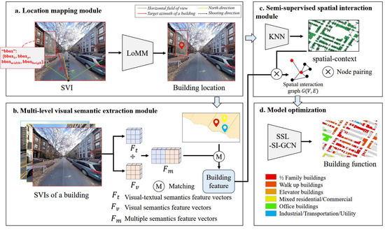 To alleviate this issue, this paper proposes a multi-semantic semi-supervised building function identification (MS-SS-BFI) method, which leverages multi-level visual semantics and spatial contextual semantics to improve building function identification. Specifically, a location mapping module (LoMM) is designed to align the locations of the SVIs’ buildings. A multi-level visual semantic extraction module (ML-VSEM) is developed to integrate visual semantics and visual-textual semantics from SVIs. A semi-supervised spatial interaction module (S3IM) is introduced to characterize the spatial context of buildings. The main contributions of this paper can be summarized as follows: