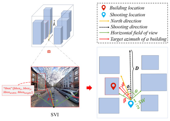 The pixel position of the building in an SVI can be calculated using the bounding box annotations of the SVI, as shown in Equation (1):