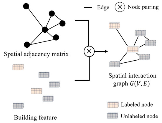 As illustrated in Figure 4, once the spatial weight matrix M is established, a spatial interaction graph is constructed. Each node corresponds to a building instance and is associated with a feature vector . Each edge captures the spatial context between the corresponding building instances and is associated with .