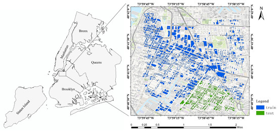 This study selects Brooklyn, one of the administrative districts of New York City, as the study area. The buildings in Brooklyn are diverse in terms of type and spatial distribution. The SVIs of the study area are sourced from “Zone 2” of the OmniCity dataset [31], which provides detailed building functional categories. As shown in Figure 5, the study area covers approximately 20.09 square kilometers, and the Brooklyn dataset contains a total of 5197 SVIs. After processing by the location mapping module, 4125 unique buildings are mapped to SVIs. The SVIs and buildings are divided into a training set and a test set. The dataset is roughly divided into a training set and a test set in a 3:1 ratio. Specifically, the training set consists of 4156 images covering 3086 buildings, and the test set comprises 1041 images covering 1039 buildings. It should be noted that this paper seeks to develop a semi-supervised approach of the training model to enhance its generalization capabilities when labeled data is limited. In the experiments, the proposed method assumes that the spatial regions of training and testing data do not overlap. That is, the data used for prediction did not participate in training. Even in production scenarios where vast amounts of prediction data are available, the proposed method does not increase the training dataset size, thus alleviating computational bottlenecks of semi-supervised models.