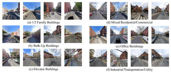 The building functional categories in the study area include six categories: 1/2 Family Buildings, Walk-Up Buildings, Elevator Buildings, Industrial/Transportation/Utility, Mixed Residential/Commercial, and Office Buildings. A detailed description of each category is listed in Table 1. Figure 6 illustrates each category with four samples.