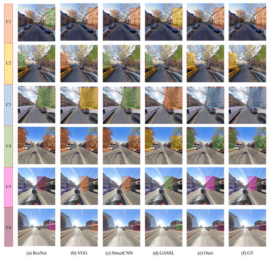 Visualized results of (a) ResNet, (b) VGG, (c) StructCNN, (d) GASSL, (e) the proposed method, (f) ground truth in the Brooklyn dataset.
