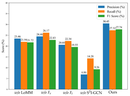 To further investigate the effect of each component within the proposed method, ablation experiments were conducted by systematically removing the following key components: (1) the location mapping module (w/o LoMM); (2) visual semantic features (w/o ); (3) visual-textual semantic features (w/o); and (4) the semi-supervised spatial interaction GCN (w/o S3I-GCN). Here, “w/o” indicates that the component is removed from the proposed method. The results are reported in Figure 8.