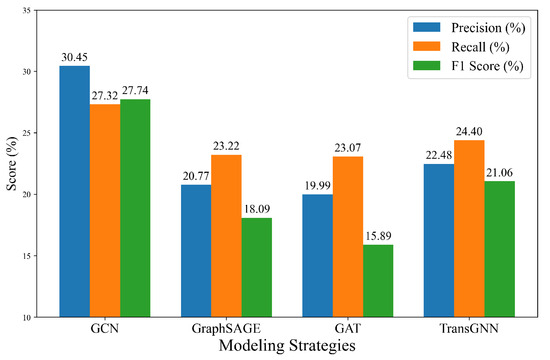 As shown in Figure 9, GraphSAGE achieves a slightly lower Rec. of 23.22% and Pre. of 20.77%, resulting in an F1. of 18.96%. TransGNN obtains a Rec. of 24.40% and Pre. of 22.48%, resulting in an F1. of 21.06%. Overall, these results demonstrate that GCN substantially improves the model performance across multiple metrics, including Pre., Rec., and F1., by effectively capturing spatial dependencies among buildings.