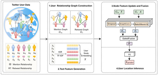 With the rapid development of mobile communication and Internet technologies, Twitter has emerged as a major social platform. Users use it to record and share aspects of their daily lives. Tweets often contain explicit or implicit geographic information. This information has great value in various research and application domains, such as user behavior analysis [1,2], event geolocation [3,4], and targeted advertising [5]. However, according to a study by Luo et al. [6], only about 1% of tweets are geotagged, making geolocation based on explicit data extremely difficult. Furthermore, social media data are typically unstructured, colloquial, and noisy, further increasing the complexity of geolocation inference. Consequently, accurately inferring user locations from tweet content and social relationships has become a key research focus.