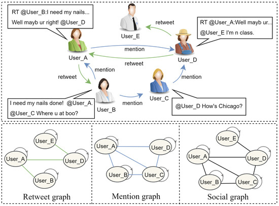 An illustrative example of social relationship graph construction. Top panel: Users (User_A–User_E) with sample tweets, mentions (blue arrows), and retweets (green arrows). Here, “RT @User” indicates a retweet, and “@User” indicates a mention. Bottom panels: (left) retweet graph; (middle) mention graph; (right) social graph combining both. A mention relationship exists between User_A and User_C, as both mention User_D.
