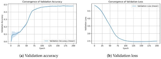 The changes in validation metrics clearly illustrate the model’s convergence process. In the early stages of training, the validation accuracy rapidly increased from approximately 0.1 to 0.4, while the validation loss dropped significantly, indicating that the model was effectively learning key features. As training progressed to around epoch 100, accuracy began to stabilize, ultimately fluctuating around 0.48, suggesting that the model had largely converged. Correspondingly, the validation loss declined more gradually in the later stages and remained at a low level without noticeable increases, indicating the absence of substantial overfitting. Overall, the model exhibited good convergence over 200 epochs: validation accuracy gradually stabilized, and the loss function remained low, demonstrating an efficient training process and a certain degree of generalization capability.