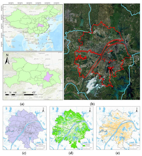Location of Wuhan and the research area of this study. (a) The location of Wuhan in China; (b) study area represented by the red outline on a satellite image; (c) study area at the street level scale; (d) green space in the study area; (e) impervious surfaces in the study area.