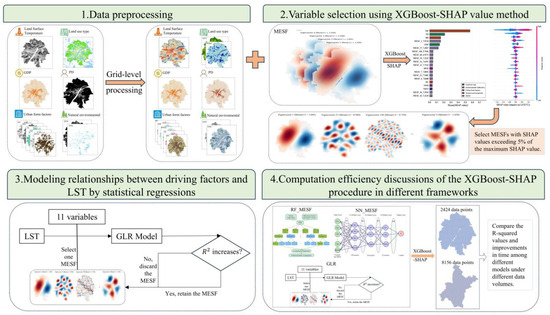 The main contribution of this study includes three aspects. First, the study formulates an accelerated variable selecting procedure by integrating XGBoost-SHAP methods to significantly improve the computation efficiency of global–local regression. Second, the research reveals impacting mechanisms of eleven driving factors within four categories on LST of Wuhan central areas. And third, the work extends the conceptual framework of EGLR (i.e., the efficiency improved global–local regression) to machine learning based models, enriching methodological toolkit for urban heat island analysis.