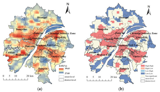 Spatial distribution of land surface temperature of the study area of Wuhan. (a) The global distribution map; (b) The local clustering map.