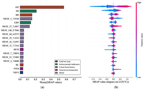 Figure 5 presents the SHAP feature importance summary plot for the influencing factors and Moran eigenvectors. Figure 5a illustrates the importance ranking of variables in relation to LST variation, ordered from the most to the least important. Figure 5b offers a local explanation of how these variables impact LST changes, visualizing the SHAP values and their directions for each variable. Here, red points represent high feature values, while blue points represent low feature values.