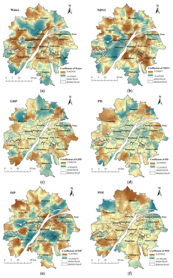For the land use type factors, both percentage of water area (Water) and NDVI show significant spatial non-stationarity (Figure 7a,b). The mean coefficient of the percentage of water body is −0.019, indicating a weak negative correlation to LST. However, coefficients in local areas tell a different story. Negative correlation coefficients can be observed in the southern part of Huangpi District, the eastern and northern parts of Dongxihu District, Hanyang District, and the East Lake area, as well as along the edges of the study region. These areas are rich in water bodies, whose high specific heat capacity slows the rate of temperature increase and helps regulate the local microclimate [61,62]. Through these mechanisms, water bodies absorb heat during the day and release it at night, effectively lowering the surrounding environmental temperature. Unexpectedly, however, Jiang’an District, Jianghan District, and Wuchang District, located on both banks of the Yangtze River and likewise endowed with abundant water resources, exhibit positive correlation coefficients. In some water areas, an “urban heat bath” effect appears (Figure 7a). This phenomenon may be associated with high building density around lakes and deteriorating ventilation conditions. Brans et al. [63] reported that the impact of urbanization within a radius of 50 m on lake water temperature was much larger than the impact of urbanization in the vicinity of 3200 m.