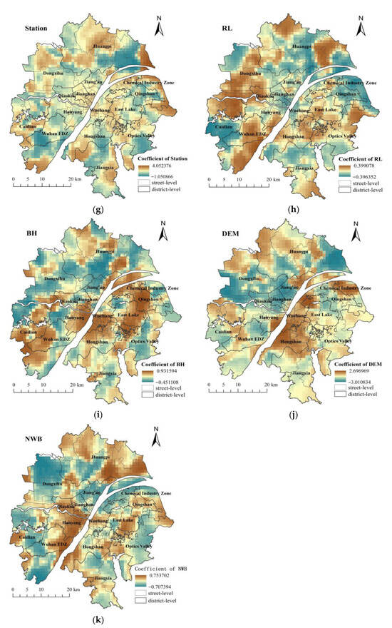Spatial distributions of the coefficients of the eleven variables: (a) water area (Water), (b) normalized difference vegetation index (NDVI), (c) gross domestic product (GDP), (d) population density (PD), (e) impervious surface area (ISP), (f) the number of points of interest (POI), (g) the number of bus stops (Station), (h) road length (RL), (i) building height (BH), (j) elevation (DEM), and (k) distance to the nearest water body (NWB). Red indicates a positive correlation with the land surface temperature (LST), green indicates a negative correlation, and yellow indicates no correlation.