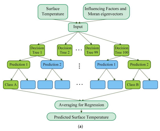 where represents the predicted value of LST in this study, denotes the explanatory variables, and is the number of trees; represents a classification and regression tree (CART) established in the direction of residual reduction based on the ()th tree.