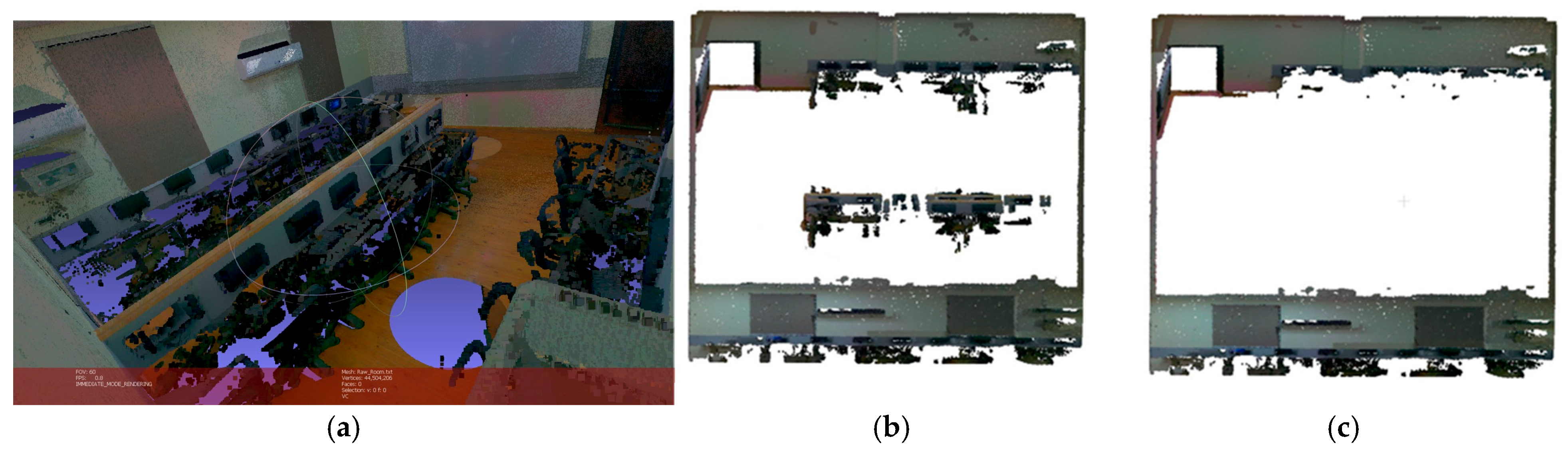 | (b) Density-filtered + RandLA-Net (Proposed) | 97.6 | 98.1 | 2.4 | Prefiltering removes outliers and clutter, yielding smoother wall masks and improved ceiling detection. |