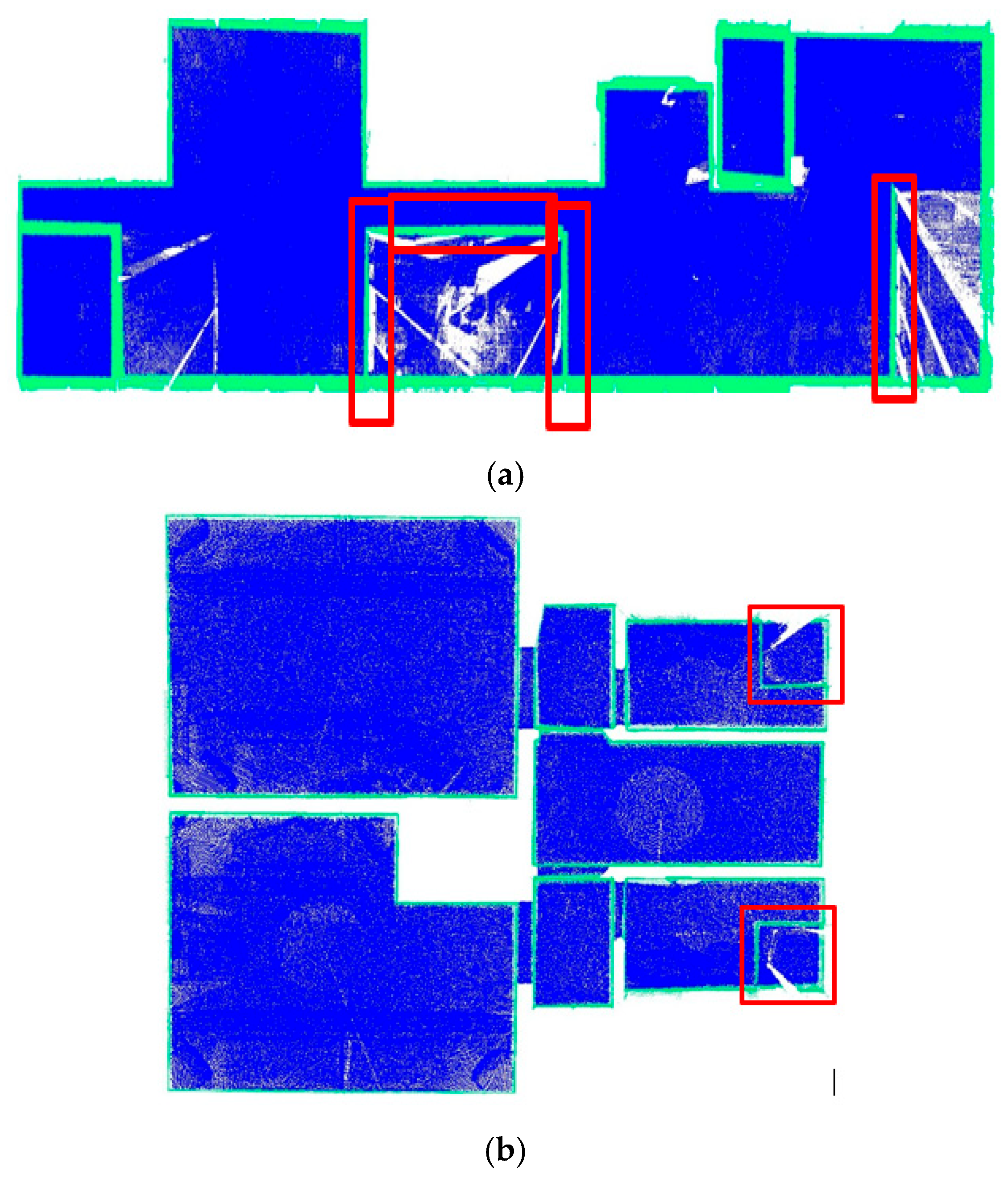 - Pouraghdam, M.H.; Saadatseresht, M.; Rastiveis, H.; Abzal, A.; Hasanlou, M. Building Floor Plan Reconstruction from SLAM-Based Point Cloud using RANSAC Algorithm. Int. Arch. Photogramm. Remote Sens. Spat. Inf. Sci. 2019, XLII-4/W18, 483–488. [Google Scholar] [CrossRef]