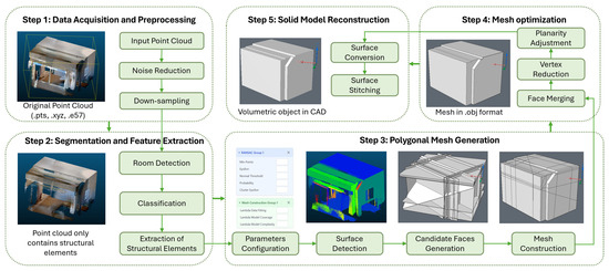 Building upon these design considerations, the proposed workflow is structured as a sequence of five interconnected stages (illustrated in Figure 1). This provides a modular and automatable sequence of operations that transforms indoor LiDAR point clouds into structured 3D solids. The following sections detail each step of our workflow, including the specific tools and algorithms used for operationalization.