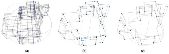 - Remove unnecessary vertices and edges: This operation identifies vertices not referenced by any faces, removes them, and remaps face indices accordingly (see Figure 2c). This detects vertices lying on a straight segment between two neighbors within a distance threshold and position epsilon. It removes them and reconnects edges to preserve polygon shape.